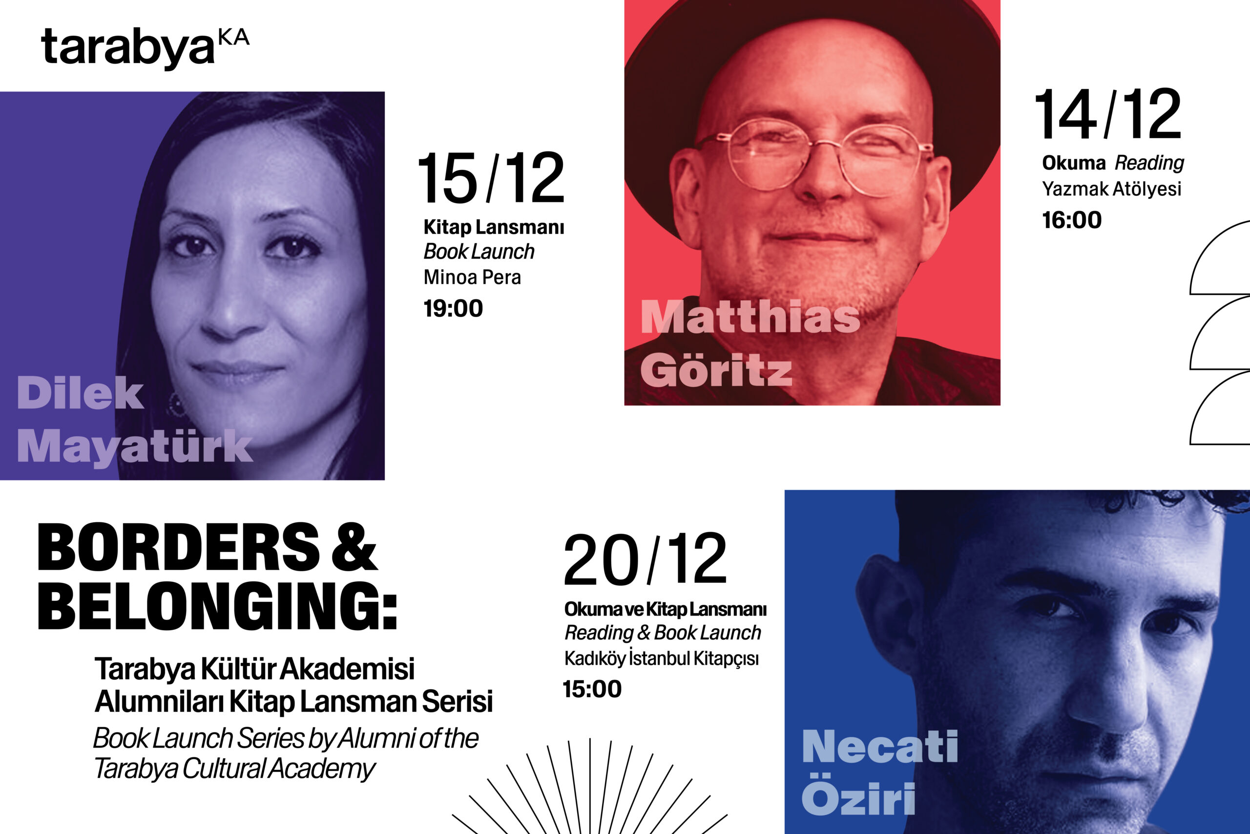 Im Dezember 2025 feiert die Kulturakademie Tarabya die Veröffentlichung von drei Büchern, die während und nach Residenzaufenthalten in Istanbul entstanden sind – und nun erstmals auf Türkisch vorliegen. Die drei Autor:innen Dilek Mayatürk, Matthias Göritz und Necati Öziri präsentieren in Istanbul und darüber hinaus literarische Werke, die sich mit der Spurensuche über Grenzen und Generationen hinweg auseinandersetzen.
