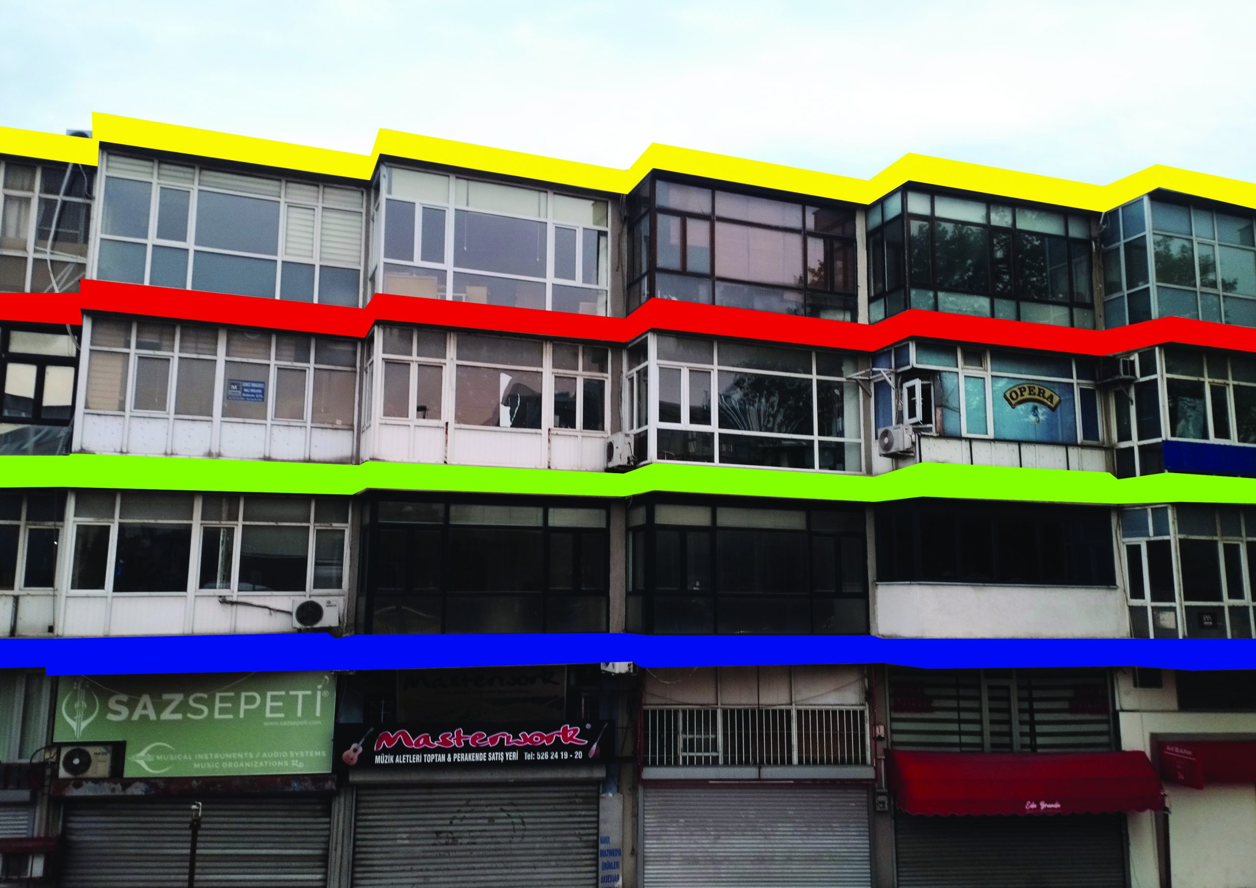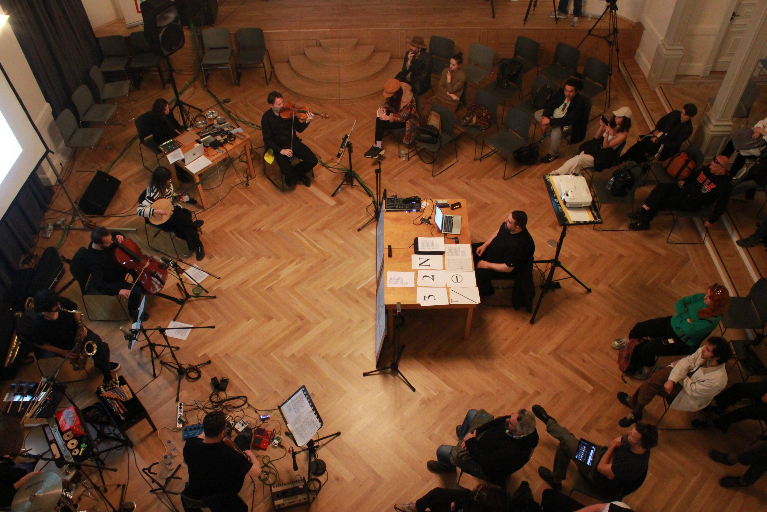 In various sections, the musicians perform solo, in small groups or in large group orchestral situations. At times, the musicians play or interact with the projections, which function as graphic or video scores with prepared instructions for the players. The musical material presented can be acoustic, electro-acoustic or electronic, and visual material (photos, videos) can be transformed and become the source material from which graphic scores and instructions are derived. The composition draws from the broad spectrum and community of Istanbul’s experimental scene with musicians from styles such as improvisation, contemporary music, noise, sound art, electroacoustic or traditional Turkish music and collages, samples, layers and recomposes this potential with the city’s never dormant original and archetypal soundscape. Much of the (audiovisual) footage used was collected by the composer himself or comes from various archives, junk stores and fellow artists who kindly provide some of their unique recordings.