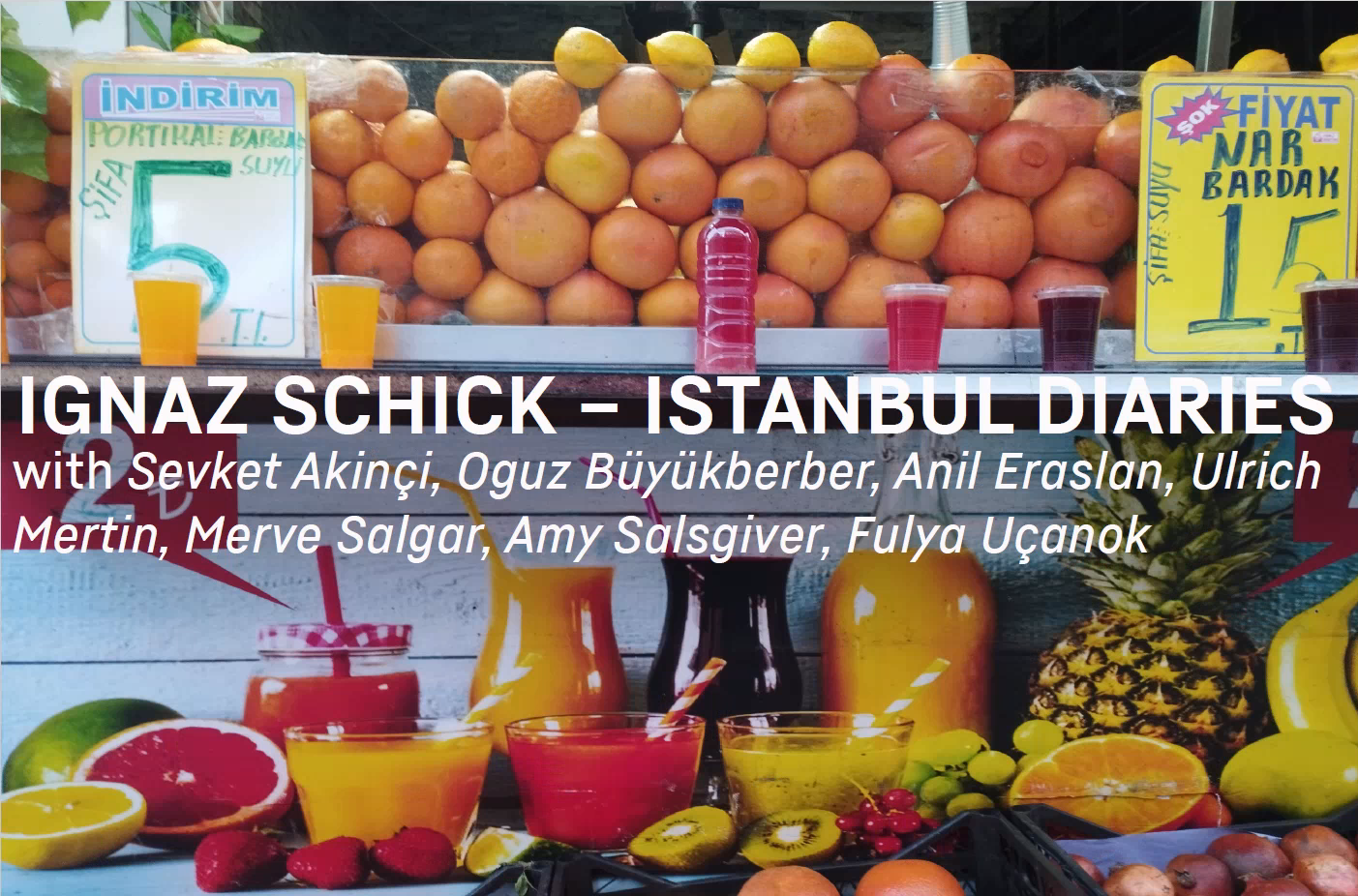 Supported by the Alumni Fund of the Tarabya Academy of Culture, Istanbul Diaries was realized by Ignaz Schick together with Sevket Akinçi, Ali Onur Olgun, Anil Eraslan, Ulrich Mertin, Merve Salgar, Amy Salsgiver and Fulya Uçanok n May 3rd and May 4th at the Orient Institut Istanbul.